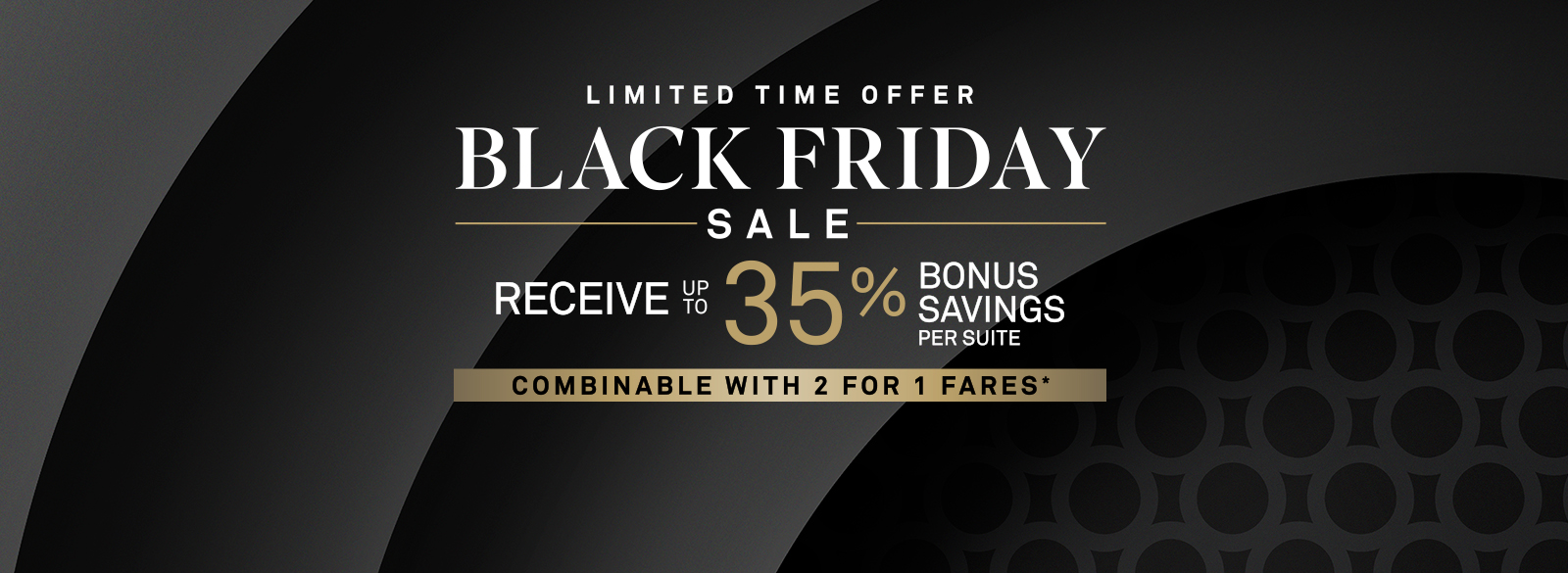 Black Friday Savings: Bonus savings of up to 35% are available on select departures. Savings percentage is based on 2 for 1 Fares, cruise element only excluding port charges, land, air or other add-ons, and vary by cabin category and departure. Combinable with 2 for 1 Fares and non-refundable savings; not combinable with any other offer. Deposit required at time of booking; pay in full required 10 months prior to departure. If sailing is within 10 months, you can pay in full within 30 days to receive these offers, or 90 days prior to departure, whichever is soonest. Guests cannot use Flexible Booking Plan or Platinum Protection Plan to move or cancel/rebook to take advantage of this offer. Savings applicable to groups; restrictions apply.