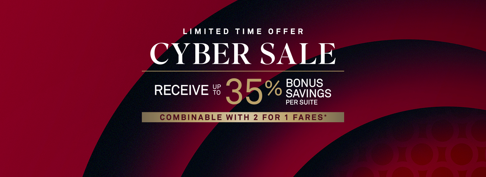 Cyber Sale Savings: Bonus savings of up to 35% are available on select departures. Savings percentage is based on 2 for 1 Fares, cruise element only excluding port charges, land, air or other add-ons, and vary by cabin category and departure. Combinable with 2 for 1 Fares and non-refundable savings; not combinable with any other offer. Deposit required at time of booking; pay in full required 10 months prior to departure. If sailing is within 10 months, you can pay in full within 30 days to receive these offers, or 90 days prior to departure, whichever is soonest. Guests cannot use Flexible Booking Plan or Platinum Protection Plan to move or cancel/rebook to take advantage of this offer. Savings applicable to groups; restrictions apply.