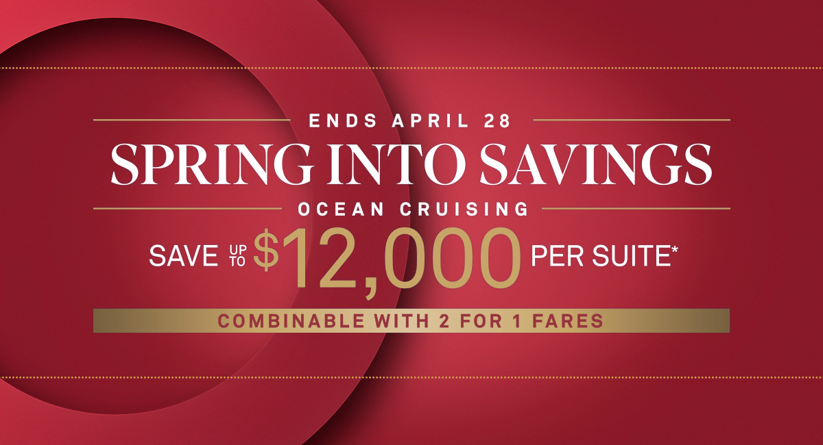 Choose from a collection of itineraries touching all seven continents. Book soon with this limited time sale and enjoy 2 for 1 Fares plus up to $12,000 in savings per suite on select ocean voyages.