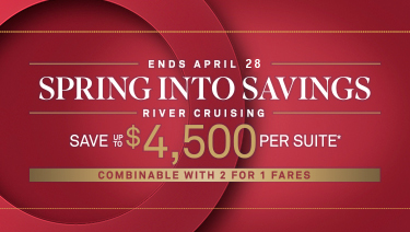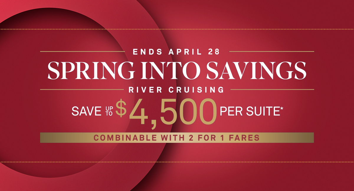 Spring into Savings: Bonus savings of up to $1,500 per suite ($750pp) are available on select departures. Savings vary by departure. Combinable with 2 for 1 Fares and FlexCredit offer. Not combinable with Scenic Select. Deposit required at time of booking.