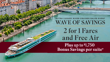 Scenic’s Wave of Savings Sale offers you Bonus Savings of up to $1,750 per suite plus 2 for 1 Fares and Free Air on select ultra-luxury 2025-2026 River cruises.